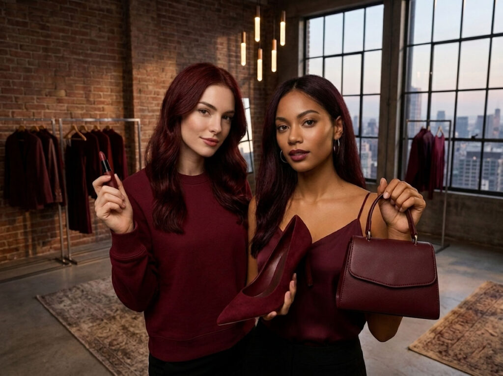 - Cool burgundy → cool/rosy lips, silver jewelry, black or deep-toned accessories