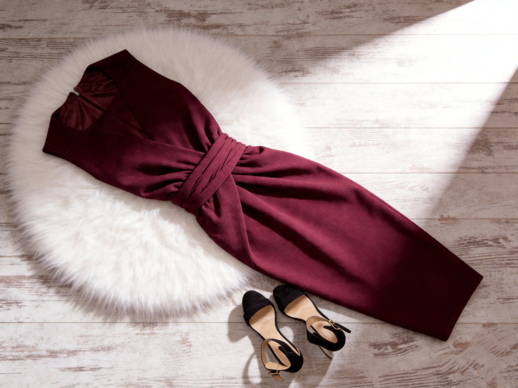 - Warm wine red → warm lip tones, gold jewelry, brown shoes/bags