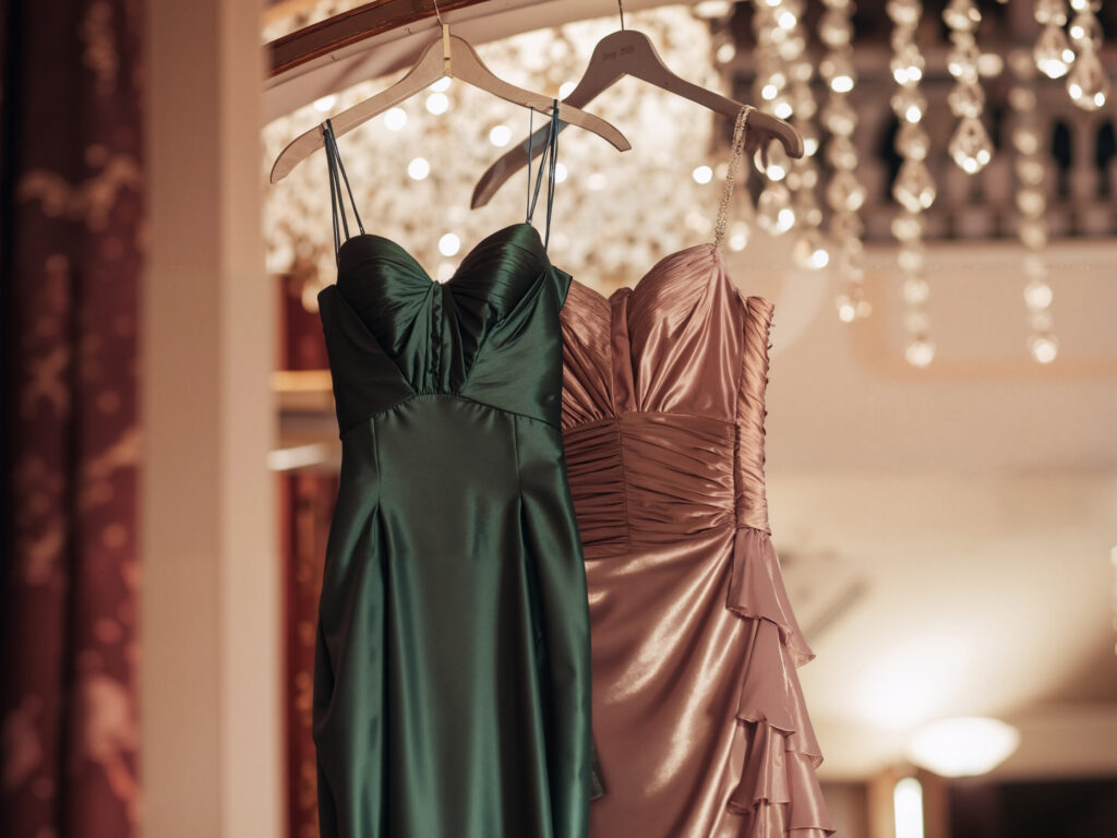 Satin Evening Dresses in Emerald & Rose Gold